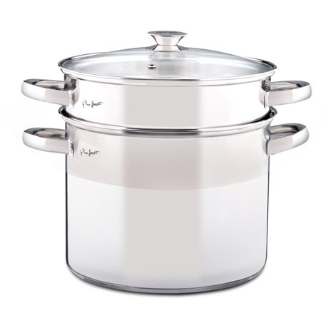 وعاء الباستا مصنوع من فولاذ مقاوم للصدأ من الفئة الأولى. هذا القدر مصنوع من الفولاذ المقاوم للصدأ من الدرجة الأولى 18/10 وبه قاعدة سميكة مزدوجة. القدر من الداخل المصنوع من الفولاذ المقاوم للصدأ 18/ 10 يعمل كمبخر أو مصفاة ويتميز بمقابض مريحة للتعامل المنفصل. وغطاء مصنوع من زجاج متين ومنفذ بخار للتحكم في الطهي بشكل دقيق.