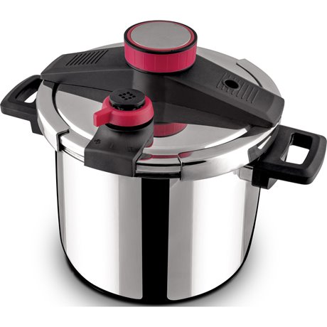 حلة الضغط المصنوعة من الفولاذ المقاوم للصدأ 18/10 من الفئة الأولى وبلاستيك قوي التحمل. غطاء سهل الاستخدام يمكن فتحه بيد واحدة. باستخدام التحكم بالضغط، يمكن إعداد وجبات شهية بسرعة كبيرة. حلة الضغط مجهزة بمقياس للضغط، وصمام أمان مزدوج، وفتحة أمان وقابس أمان للضغط الزائد ومقابض فائقة القوة لسهولة التعامل وحمايتك من الحرق. حلة الضغط بقاعدتها المزدوجة مصممة للاستخدام مع جميع أنواع المواقد بما في ذلك المواقد التي تعمل بالحث.