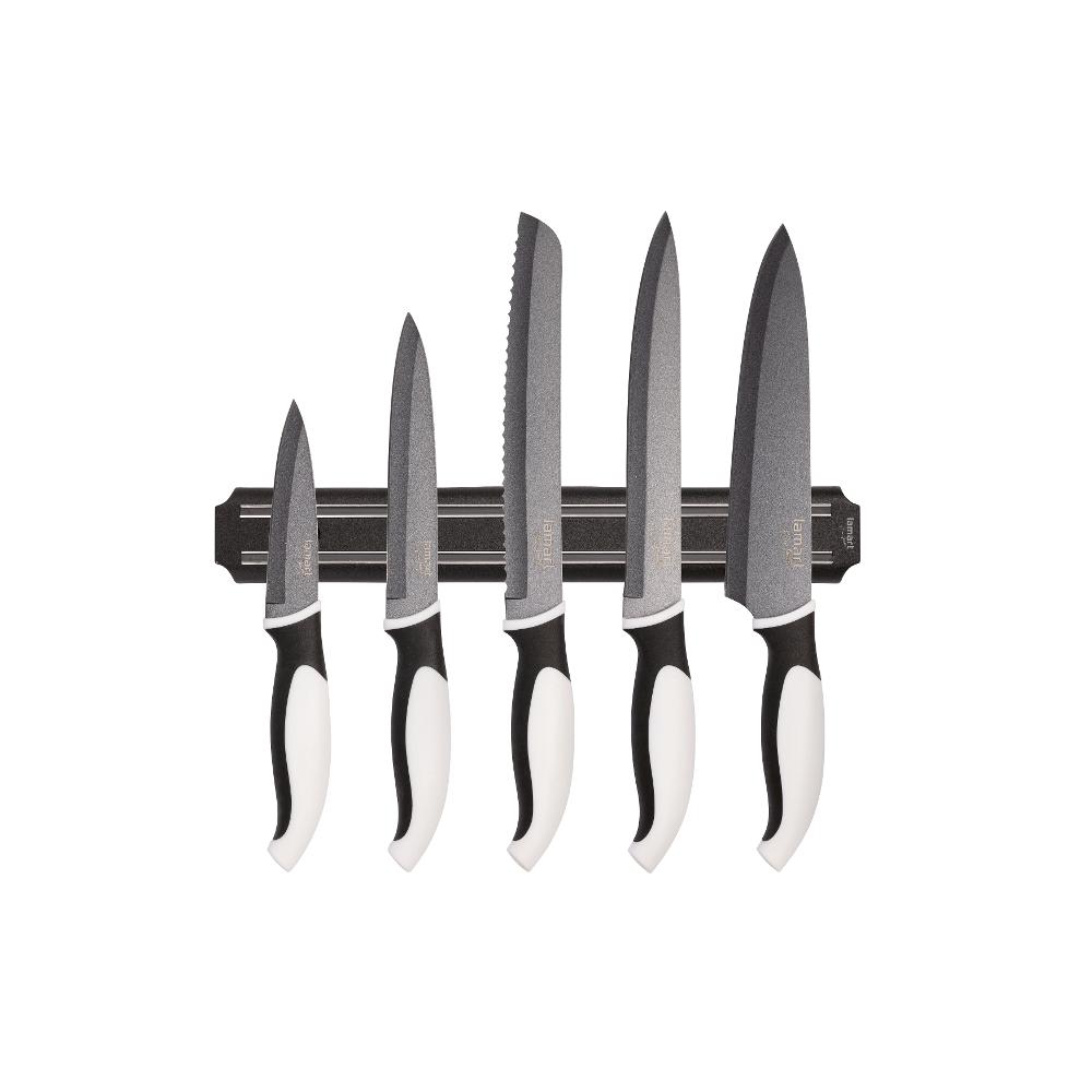 مجموعة سكاكين مصنوعة من الفولاذ الكروم عالي الجودة. مزودة بشريط مغناطيسي عملي لوضع السكاكين بسهولة. تشتمل على مواد التثبيت. شفرة حادة جدًا ومقبض مريح للحصول على أقصى تأثير ولضمان الأمان أثناء الاستخدام. يتم غسلها وتجفيفها بعد الاستخدام، وتخزينها بعيدًا عن متناول الأطفال. تنبيه: إن التعامل غير السليم يجعل كل سكين خطيرًا.