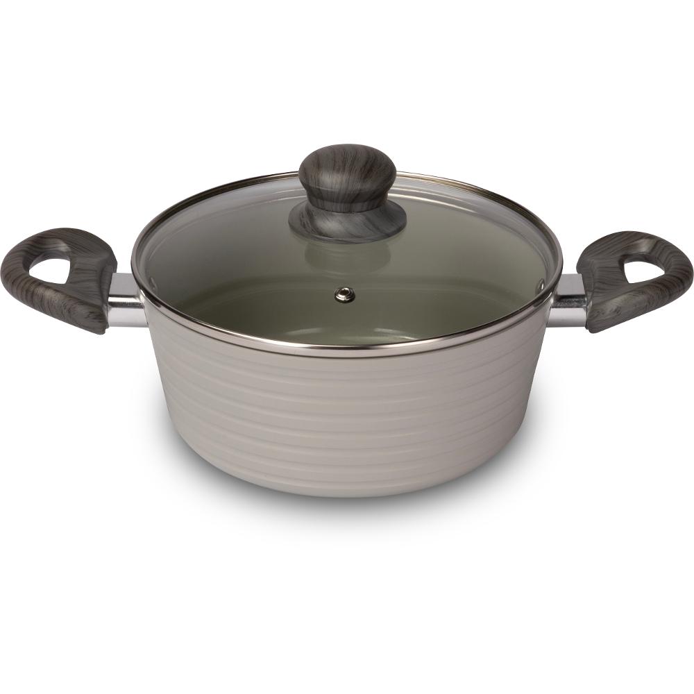 مصنوعة من الألمنيوم المتين للغاية. أواني الطهي مزودة بسطح من السيراميك المقاوم للخدش والاحتراق، وقاعدة سميكة مع مقابض أنيقة للغاية لمزيد من الأمان والعملية والراحة. غطاء من الزجاج المتين ومخرج بخار للتحكم الدقيق في الطهي. مادة السيراميك مقاومة جداً للحرارة وتمنع الطعام من الخَبز والطهي الصحي. سهولة الصيانة والتنظيف..